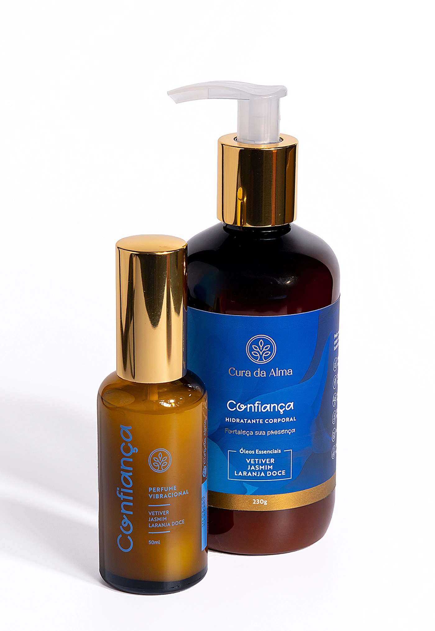 O hidratante e o perfume Confiança atuam em sinergia por meio dos óleos essenciais de Jasmim, Vetiver e Laranja Doce, que auxiliam na estabilidade emocional, no acolhimento interno e na construção de uma segurança firme e tranquila. O toque ancora, nutre e convida o corpo a relaxar. O aroma envolve e sustenta, criando uma sensação contínua de equilíbrio e confiança.